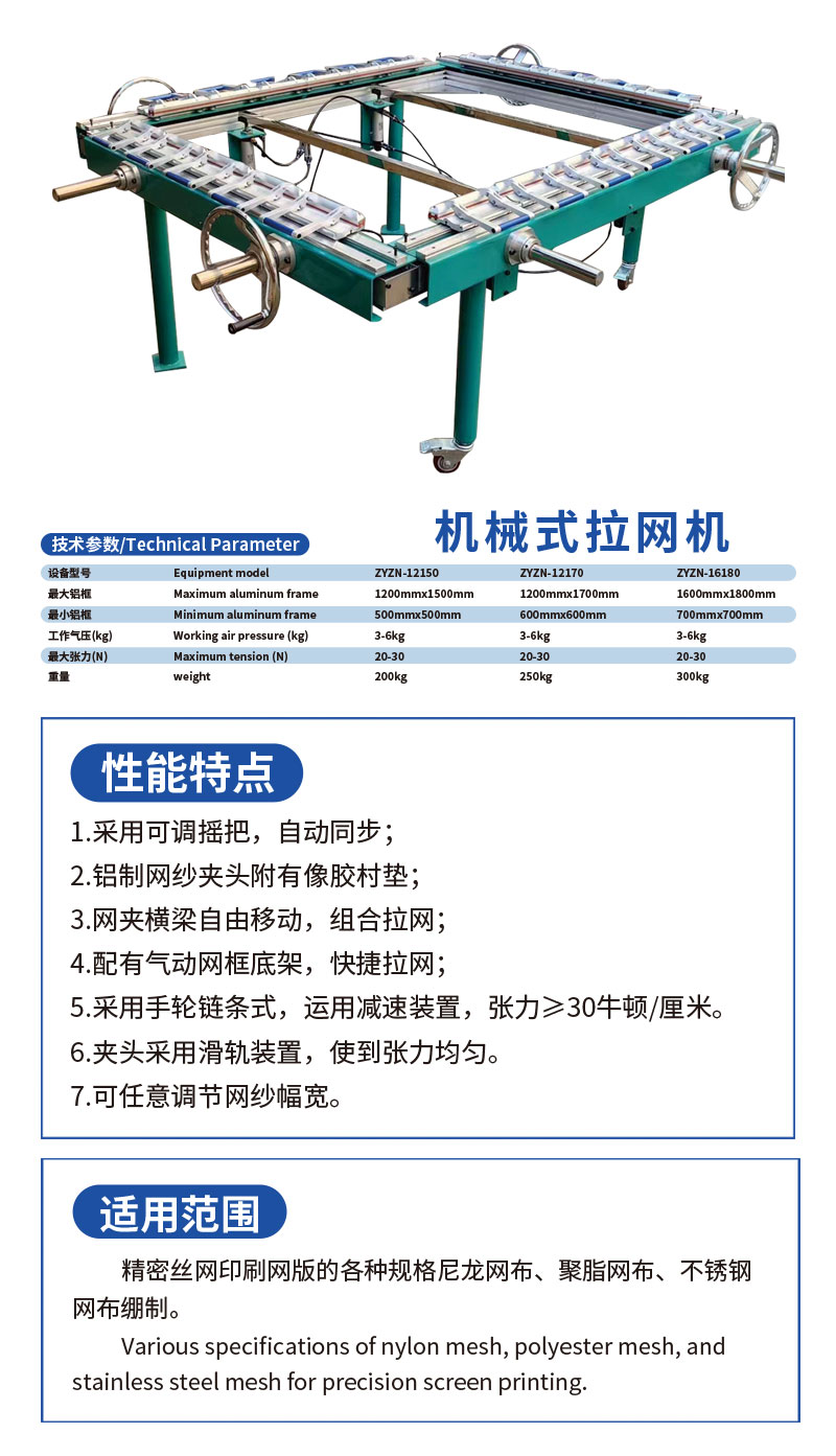 机械式拉网机ZYZN-12170 上一篇« 机械式拉网机ZYZN-16180 下一篇机械式拉网机ZYZN-12150 » 您可能喜欢 UV04胶印紫外线光固机ZYZN-740 网版烘烤箱ZYZN-90120 垂直升降网印机ZYZN-6080 UV手摆离线半自动丝印冷烫机ZYZN-960 UV紫外线光固机ZYZN-1000 网版烘烤箱ZYZN-12150 自动取料机械手ZYZN-1500 刮刀研磨机ZYZN-1200 机械式拉网机ZYZN-12170