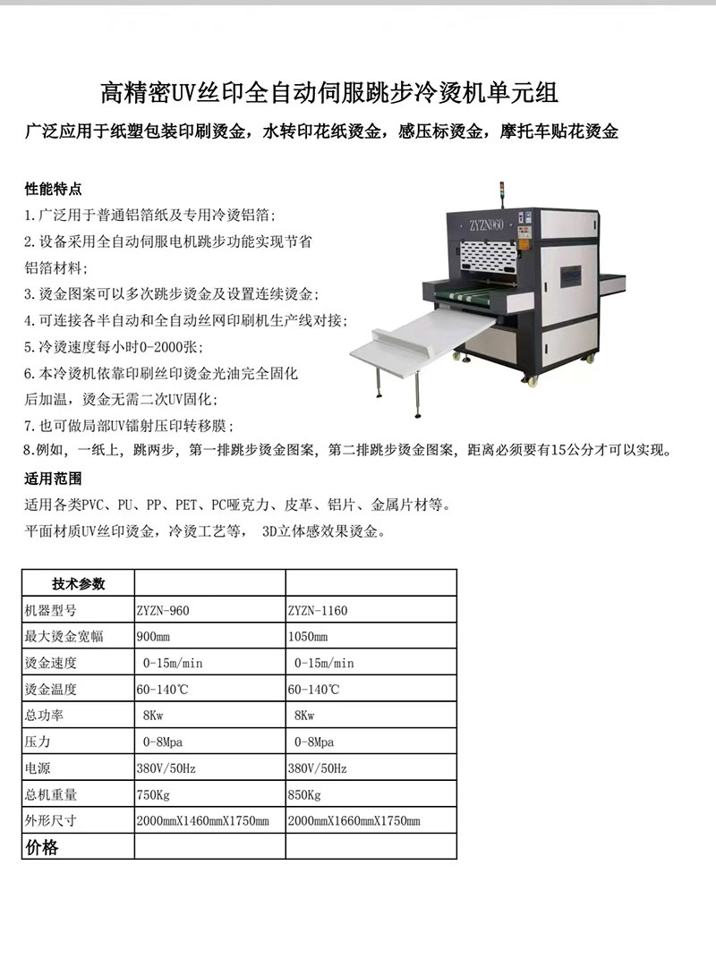 UV全自动伺服跳步冷烫机单元组ZYZN-960 上一篇« UV全自动伺服跳步冷烫机单元组ZYZN-1160 下一篇 您可能喜欢 机械式拉网机ZYZN-16180 远红外线温控烘道ZYZN-900 远红外线温控烘道ZYZN-750 刮刀研磨机ZYZN-900 斜臂式平面网印机ZYZN-5070 垂直升降网印机ZYZN-4060 自动取料机械手ZYZN-1500 自动撒金葱粉机 UV紫外线光固机ZYZN-750