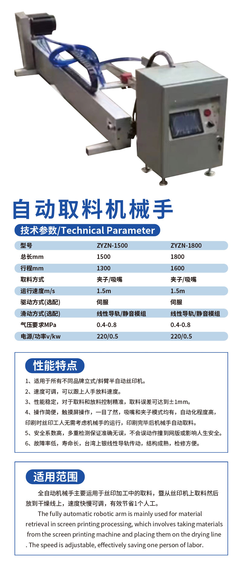 自动取料机械手ZYZN-1800 上一篇« 高精密晒版机ZYZN-90120 下一篇自动取料机械手ZYZN-1500 » 您可能喜欢 自动收纸机 机械式拉网机ZYZN-12150 UV全自动伺服跳步冷烫机单元组ZYZN-960 机械式拉网机ZYZN-12170 斜臂式平面网印机ZYZN-9012 机械式拉网机ZYZN-16180 高精密晒版机ZYZN-90120 UV手摆离线半自动丝印冷烫机ZYZN-720 刮刀研磨机ZYZN-900