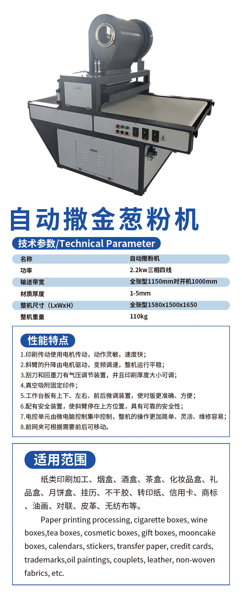 自动撒金葱粉机 上一篇« 远红外线温控烘道ZYZN-750 下一篇UV04胶印紫外线光固机ZYZN-680 » 您可能喜欢 机械式拉网机ZYZN-12150 刮刀研磨机ZYZN-900 UV全自动伺服跳步冷烫机单元组ZYZN-960 垂直升降网印机ZYZN-4060 网版烘烤箱ZYZN-12150 刮刀研磨机ZYZN-1000 自动收纸机 远红外线温控烘道ZYZN-900 UV手摆离线半自动丝印冷烫机ZYZN-960